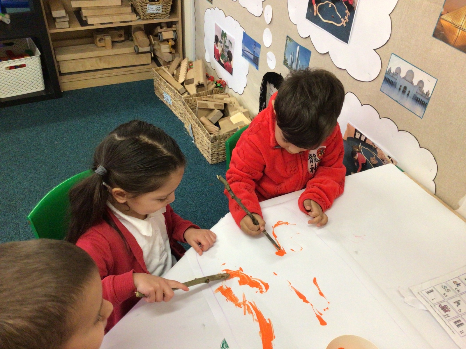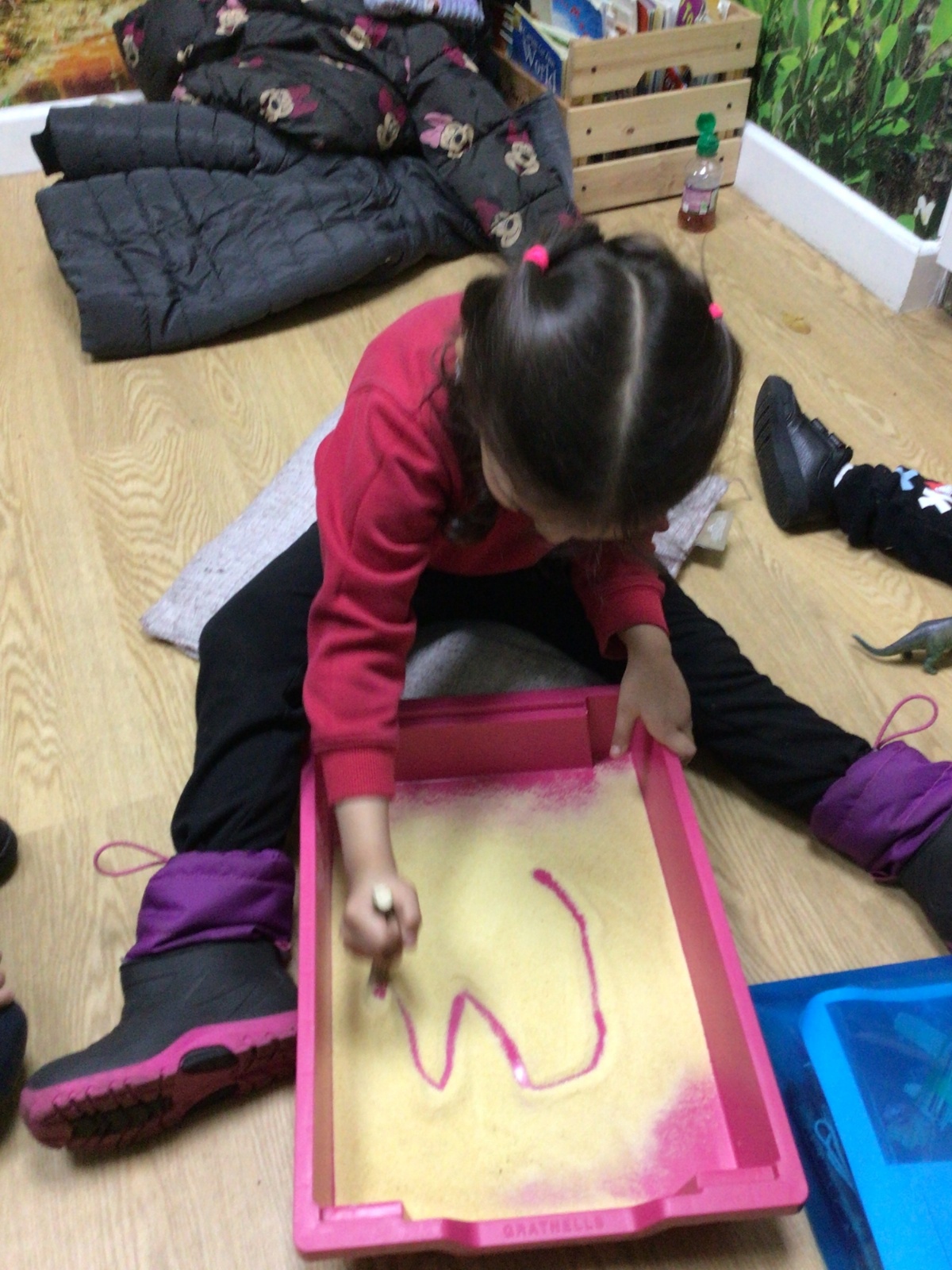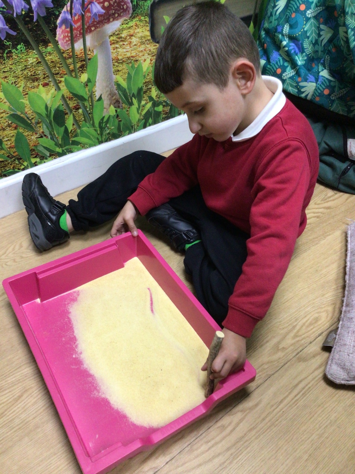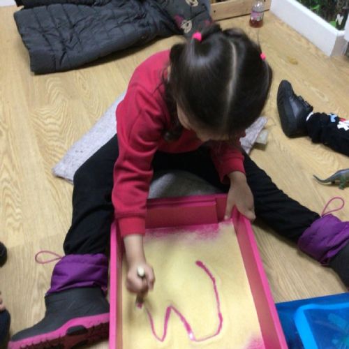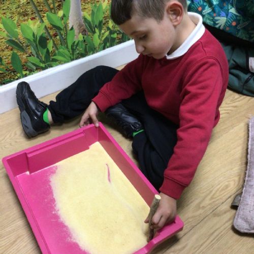 The children listened to the story "It's Not a Stick" and used a stick to make letters.